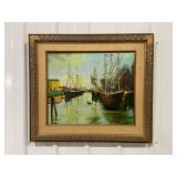 Ben Maile Original Canvas Painting of A Ship At The Dock, Signed By Artist and Framed, British Artist Born In 1922