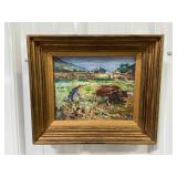 Framed Painting of Ox Plow Team By Bhk, 47, Frame Is In Poor Condition