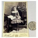 Antique c. 1880 Young Girl Sitting in a Fancy Ornate Carved Chair Holding a Book Albumen Cabinet Card Photograph |