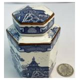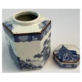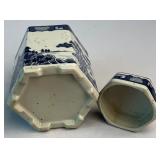 Vintage Blue and White Transfer Ceramic Asian Covered Hexagon Tea Caddy Jar |