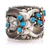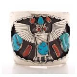 - 3009 VINTAGE ELAINE SAM NAVAJO STERLING SILVER TURQUOISE, CORAL, & BEAR CLAW CUFF