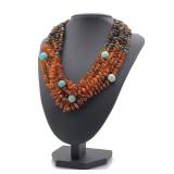 - 3022 NATIVE AMERICAN 3 STRAND HAND KNOTTED AMBER TURQUOISE NECKLACE