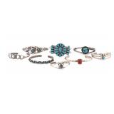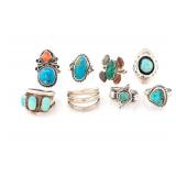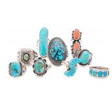 - 3563 9PC NATIVE AMERICAN / SOUTHWEST STERLING SILVER TURQUOISE & CORAL RINGS
