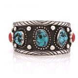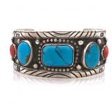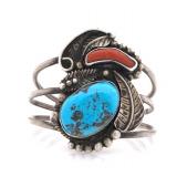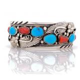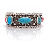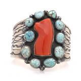 - 3544 WET NATIVE AMERICAN STERLING SILVER TURQUOISE CORAL CUFF