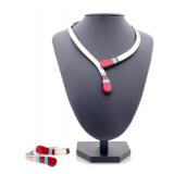 - 3017 VINTAGE 5PC NATIVE AMERICAN STERLING SILVER CORAL & MOTHER OF PEARL JEWELRY SUITE