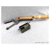 1 This is an EXTRA lot, please do not bid. 2 This is an EXTRA lot, please do not bid. 736 Griswold No. 4 cast iron skillet with nickel plating and large logo. Bottom marked Erie PA USA, 702. In good condition, 7" over rim. 390 Weed Eater Snap n Go , SG 12, weed whacker. Includes bonus trimmer line. Needs a battery. 400 Ridgid 18" pipe wrench with good sharp jaws and a straight handle. 410 Assortment of open and box end wrenches incl. Plumb, Craftsman, Ridgid, Plamera, and more. 551 Nice leather gun boot has sturdy sides and measures 4' long and 8-1/2" wide. In nice condition. 395 No shipping. Must be 21 years old to purchase. Ph. Boilieux Deluxe Decanter of 80 proof Brandy, 750ml. 405 No shipping. Must be 21 years old to purchase. Calvert Special Canaian Rye Whisky. Seal is marked 1959. 561 Heavy hard sided gun case for a take down rifle or shotgun; or fill with handguns. Measures approx 31" x 8-1/2" x 6-1/2" OD. Key not incl. Presto combination lock is currently set but not sure if that's the code. Padded interior, nice box. 572 Tillman and other welding gloves and supplies incl. sleeves, sweatband, helmet bib, more. 582 Trio of bottle jacks with no jacking handle; Green bottle jack stands 9" tall 1065 Vintage 1971 Polaris Charger 400 snowmobile needs a new fuel line. Twin cylinder engine turns over with good compression. Classic sled is ready for restoration. 594 Neat old National cash register has been updated with a new custom air brushed paint job and great detailing. Cash register measures approx. 18" tall x 15" deep x 11" wide. Came from a tattoo shop. 604 No shipping. Kwik Star 20 lb propane tank is nearly empty with newer style OPD valve. 633 Pair of Iverson 13x46 snowshoes show reasonable wear and are in good condition. 614 Four books including Shotguns by Elmer Keith, Firearms of the Confederacy by Fuller & Steuart, African Rifles & Cartridges by John Taylor, The Gun & Its Development by W.W. Greener. 624 Trio of sporting folding pocket knives. Each knife measures 5-7/8" overall and each features hunting, fishing, shooting designs. Comes in a wooden box with a magnetic closure which measures approx 4-1/2" square. 634 Pair of old-style Safe Sport snowshoes with Bob Maki bindings. Measure about 56" x 10". Some rawhide pieces loose, and crack noted at V of one. Use in the woods or hang on the cabin wall. 644 Pair of vintage Durbin chain load lever binders measure 18" overall 1064 Plow bank grinder or rototiller depending on the season. Ariens Model RT5020 rear tine tiller with a 5 hp engine and very good tires. Starts easily, runs well. 654 Hunting & Fishing Collectibles Magazine issues, dates range 2014 to 2020 all stored in a file box. 664 Tapco SKS magazine, is code 3E2Q7, and stands 7" tall. Also comes with a Leapers SKS upper receiver cover scope mount with 1" rings. 674 Set of four adjustable wooden claps with 10" and 12" long wooden jaws. 683 1" irrigation tube with factory sealed ends. Roll is 2-1/2' across and hand labeled 100'. 1005 Burroughs brand adding machine measures approx 19-1/2" x 8-1/2". All number buttons and Sub Total button works and addition part is accurate from what I see. Lever functions. Red and Repeat buttons need to be lifted up manually. Receipt part works and still has some ink left. Really neat piece or history. 1015 Trio of hand planers with no obvious brand names. Largest is just under 7" long. 1025 Pair of Ford model T or model A ignition coils, measure approx. 3"x2 1/4"x 5" tall. 1035 Drop forged camp hatchet and two multi-use hatchets with nail pullers and more. Longest about 18". Great for camping next summer or to take in the woods with you this winter. 1044 Will ship without liquids. 20 gauge shotshells and more. Plus Hoppes No. 9 gun cleaning supplies, Shotshell boxes by Remington and Peters - excellent if you do your own reloading, reloading manual for .300 and .375 H&H Magnums, Lyman shotshell reloading handbook, GWS vehicle - mount game warning system, 7-3/4" Rapala fillet or skinning knife, much more. 1054 Mity Mite 25 AMP Solid State Fast Charge 1,500 Watt Power-Booster battery charger is 12" wide. Model SE-250-25. 1066 Vintage Evinrude Big Twin 30 hp outboard boat motor with stands and 6 gallon OMC gas can. Serial No. 25022-15379. Measures about 4' high. Turns smoothly on clamp and has strong compression. Well cared-for piece. 1078 4 Army Motors Journal magazines, see pics for details. 1088 11 Army Motors Journal magazines, see pics for details. Interesting winter reads. 726 Vintage Bear Archery Kodiak Magnum Glass-Powered recurve bow. Hand marked 9U2435, AMO 52", 45#. Minor crackling in finishes. Arms are good with no delamination noted. Nice bow is about 4' long unstrung. 418 About 100 lbs reloading lead. Seller notes bricks are 13 Burnell hardness and good for casting bullets. 1811 5L Zenny stainless steel two-speed sausage stuffer is in nice condition. Measures about 12" x 9-1/2" over base and is 25" over top. Features two shafts for different pressing settings, one much more aggressive to get the job done faster. Handle moves smoothly. Add screw to secure handle and a spout and process your deer or similar with ease this year. Nice machine. Filling mixer in lot 1812. 1836 Antique W. & L.E. Gurley surveyors transit with original box, 7-1/2 oz. Millers Falls No. 3 plumb bob made in USA., more. Vials are good, knob on top moves front lens in and out smoothly. Focus works. North / South leveling knobs work, as of West and East. All other knobs turn as well. Top piece turns smoothly. Box with Gurley tag. Wonderful old piece. 57" C. L. Berger and Sons tripod incl, see pics. 1847 Nice looking goat mount measures 26" out from wall x 22" from horn tip to horn tip. Small cracking noted on lip, nose, near eye but in otherwise good condition with nice beard and fur. 1857 Sturdy workshop stand would be nice for a grinder or whatever you need. Has 13" x 8" top and stands 32" high. 1867 Milwaukee 1/2" right angle drill with forward and reverse