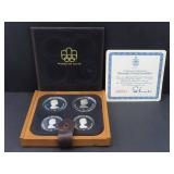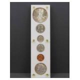 COINS & STAMPS: 1990 Liberty Dollar, 1965 Half, Quarter, Dime, Nickel, Penny; 1915 & 1976 Circulated Coin Sets; US Mint Uncirculated Coin Sets; Steel Pennies; Wheat Pennies; Buffalo Nickels; 38 Mercury Dimes; 65 Pre-1964 Roosevelt Dimes; 1977, 1977 US Mint Proof Sets (1977, 82, 83, 84, 85); 1971 Eisenhower Uncirculated Silver Dollar; 1986 Liberty Silver Dollar; 1972 Canada Olympic Coin Proof Set; Washington Quarter Collector Books; 1925 Standing Liberty Quarter; Farmers and Drovers Bank Bag; Foreign Currency; Stamps (Baseball, Olympics, Elvis, Rock N Roll, Joe Louis, US Stamp Collecting Albums, Animals, World at War, Wildlife, First Day of Issue Stamps);