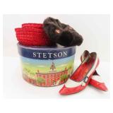 ANTIQUES: Pyrex Refrigerator Dishes; Anchor Hocking Skillet w/ Cover; 12" Basic Weber Globe; Stetson Hat Box, Ladies Hats; Sword; Reifer Regiment No 12 Sword; Vintage Cracker Jack Charms; Dwight KS Postcards;
