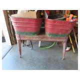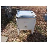 ANTIQUES & MISC: Herrick Ice Box Waterloo Iowa (Very Clean); Wheeling Double Wash Tub w/ Stand; Red Vintage Metal Glider; Cast Floral Garden Table & Chairs; Round Washtub w/ Stand; Square Diamond Pattern Vintage Metal Chairs; Hand Water Pump; Miller High Life Mirror; Bud Light Mirror; Upright Freezer; Gladiator Water Tube; White & Blue Enamel Top Table; Concrete Fisherman; Wood Carved Fish & Turtle; Rebel Fishing Boat, w/ 70 HP Johnson Outboard Motor (not running); Picnic Table x3; Cast Iron Bath Tub x2; GMC Roll Top Bed Cover; Fence; Windmill (2 Fans Are in Sections, 2 Tails, 1 Tower); Go Cart (Not Running); Truck Bed Trailer; Scrap Iron (Washers, Freezers, Heaters, Catalytic Converters, Motors); Branding Iron; Tire Repair Cabinet; Canvas Tarps; Metal Hay Pulleys and Roller; Dietz Lantern; Diamond Plate; Maytag Wringer Washer; High Flo Sprayer; Post Hole Diggers; Croquet Set; Harley Davidson Motorcycle Bags; Water Skis; Pallet Of Bricks;