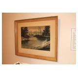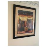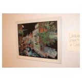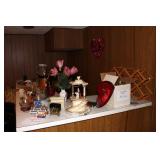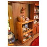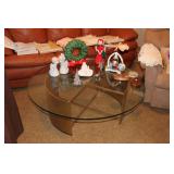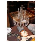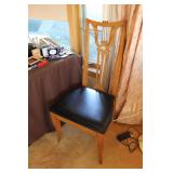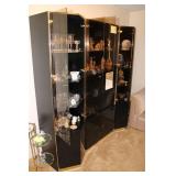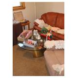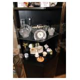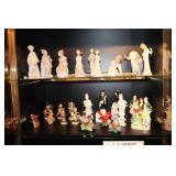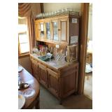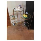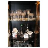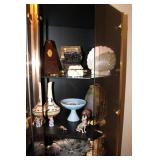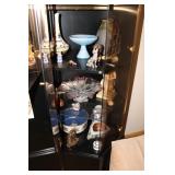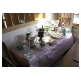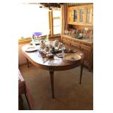 Living/Dining Room John M Smythe oval dining table with cherry finish and 3 leaves, 4 chairs with black vinyl seats Beautiful buffet with marble top and display hutch Large black and gold display cabinets (3-piece set) 4-tier brass and glass display Vintage 4-foot floor lamp Brass-look floor lamp Lladro figurines: Girl in pajamas sitting on hassock (as-is) Bride and groom Girl in white gown with leg showing Standing and seated clowns Hummel figurines: Boy and bird on fence Boy playing accordion (as-is) Girl playing "guitar" (as-is) Boy blowing horn with axe Small boy with hiking stick (as-is) Girl with basket and letter (as-is) Boy with top hat and ladder Fabulous pair of Murano birds in green, yellow and clear Heisey glass Stangl pottery bird Lenox birds Glass serving and decorative pieces Makora blue bowl with clear glass base Silver plate coffee and tea service on tray Silver plate serving pieces Wine glasses Costume jewelry