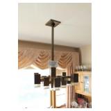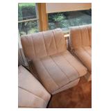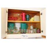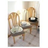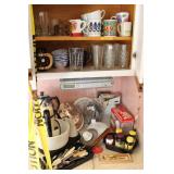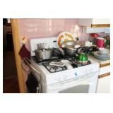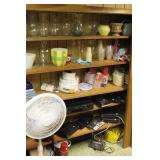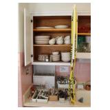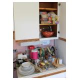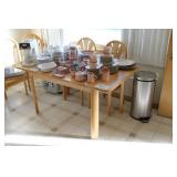 Kitchen Large square kitchen table with butcher block-look top and 5 chairs Royal China Inc. USA Celeste pattern dinnerware set, white with turquoise atomic starburst design Pfaltzgraff white dishes with woven pattern on edges (more in basement) Pink Lustre transferware including dinner plates, salad plates, bowls, serving pieces Off-white stoneware with pink and grey Assorted utensils and flatware Assorted glasses and mugs Vintage Sunbeam Mixmaster with 2 white bowls 5-speed hand mixer