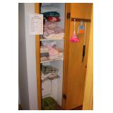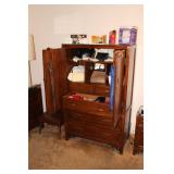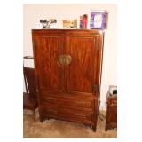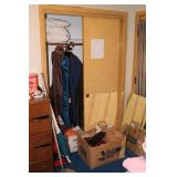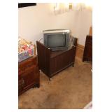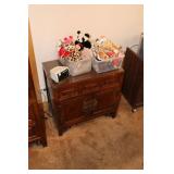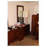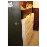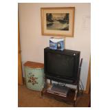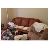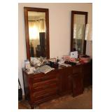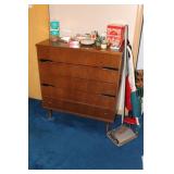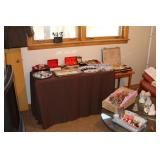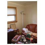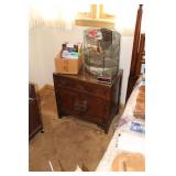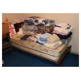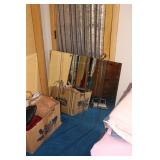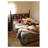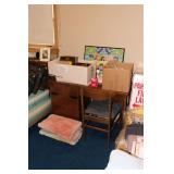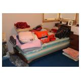 Bedrooms Century Furniture Asian-influenced vintage bedroom furniture including the full-size bed with headboard, mattress and box spring, 9-drawer 2-door dresser with glass top and pair of mirrors (as-is), wardrobe with glass top, pair of nightstands with glass tops Bassett Furniture mid-century bedroom furniture (needs TLC) including a pair of twin-size headboards and footboards (storage in headboards), tall 5-drawer dresser, 4-drawer desk and chair Pair of older twin-size mattresses and box springs Franklin brand rocker/recliner with tan faux suede upholstery Coffee table with large metal base, round glass top Framed art Brown vinyl valet Large metal and stone table lamp White floor lamp Wood-look TV stand on wheels Metal TV stand Sony Trinitron TV Small Toshiba TV Toshiba DVD/VHS player Some Christmas décor Selection of comforters, blankets, afghans, sheets Assorted towels Vinyl tablecloths Lovely fabric tablecloths Some sewing notions Picture frames Some men's clothing and ties Women's clothing, size Small/Medium Women's shoes, size 7 Women's scarves, handkerchiefs, white gloves, purses