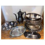 12pc Silver Plate Platters, Bowls, Tea Pot, Creamer and Sugar, Relish Tray