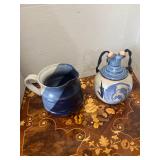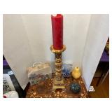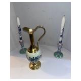 Hand Painted Delftware w/Brass Accent Pitcher and 2 Candle Holders w/Candles