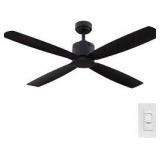 - Sleek indoor ceiling fan with integrated, dimmable LED light