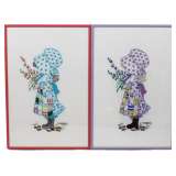 PAIR OF HOLLY HOBBIE EMBROIDERY WORKS Pair of Holly Hobbie embroidered works showing the character Holly Hobbie. First is in red frame with character outlined in blue with various designs on dress with grey boots holding pink flowers. Second is in a purple frame with character in purple dress with various designs wearing brown boots holding purple flowers. Works were given to consigner by the author of the Holly Hobbie series Denise Holly Hobbie. Size: 19 x 12.5", Est. 50-100, Lot: 32004
