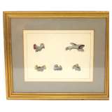 F. WILLY BIRD ILLUSTRATIONS 19TH CENTURY Lot of two framed bird tinted lithographs by F. Willy, from Iconographie de Pigeons by Charles-Lucien Bonaparte. Framed and matted under glass. Each labeled "P. Bertrand, editor; F. Willy del et lith.; Imp. Lemercier, Paris". One labeled "Ptilopus Roseicapillus, Bp. ex Less" the other "Ptilopus Flavicollus, Bp. ex Gr." Some discoloration to paper and matting. Size: 21 x 27" each (framed), Est. 30-100, Lot: 32025