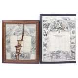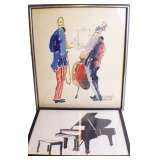 LOT OF TWO FRAMED MUSICAL PRINTS Lot features two framed works; a screen print of a grand piano on linen in black (18.5" x 15"), and a watercolor of New Orleans Jazz musicians signed lower right corner, illegible (20.5" x 23"). Size: See description, Est. 30-60, Lot: 32019