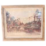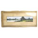 SIGNED 19TH CENTURY PASTEL PAINTING 19th Century pastel painting of a riverfront. In original frame and signed in bottom right (illegible). Size: 30.5 x 13.5, Est. 20-50, Lot: 32051