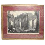 PIRANESI ENGRAVING TEMPLE OF NEPTUNE 1778 Giovanni Battista Piranesi (Italian, 1720-1778) with Francesco Piranesi (Italian, 1756-1810), engraving on paper, Plate XIV. Vue des restes du derriere du Pronaos du Temple de Neptune. Giovanni's final work, with figures filled in by his son, Francesco. Framed and matted under glass. Some water damage to back of frame, some paint loss throughout frame. Size: 36 x 29" framed, Est. 150-300, Lot: 32029