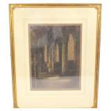 ETCHING CHOIR SCREEN & AMBULATORY AT CHARTRES Framed etching of church interior - choir screen and ambulatory at Chartres Cathedral in France. Framed and matted under glass in bronze colored frame with corner details. Paper on back of frame is stamped Oct 12 1937. Sticker on back reads "Hudson's Pictures and Picture Framing Detroit". Not examined out of frame. Size: 20.5 x 25.5" (framed), Est. 50-75, Lot: 32031