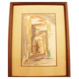 BENKER - ABSTRACT EUROPEAN STREET SCENE WATERCOLOR Framed under glass, and matted, this street scene features shoppers walking down the street. Signature "Benker", bottom right. Size: 16 x 20" (framed), Est. 20-50, Lot: 32040