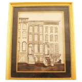 BEAR MONOCHROMATIC BROWNSTONES WATERCOLOR Grey scale urban scene, pen and watercolor. Signed bottom right "Bear 1959". Framed and matted under glass. Size: 14 x 17" (framed), Est. 20-50, Lot: 32041