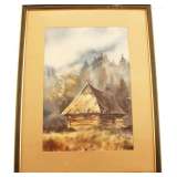 CABIN IN THE WOODS - WATERCOLOR Framed watercolor by unknown artist, featuring forest scene, with cabin. Framed under glass, matted. Some surface scratches to frame, no visible signature. Size: 16 x 21 (framed), Est. 20-50, Lot: 32047