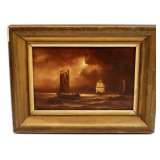 BOUSIN - NIGHT SEA - OIL ON BOARD Nautical scene - four vessels at sea; oil on board, signed bottom right "Bousin." Four areas of cracking - bottom left corner, on two middle ships, and just above center of painting. Framed in modest brown frame, some veneer loss to frame. Size: 7 x 11", Est. 20-50, Lot: 32049