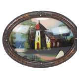 AN IMMATURE REVERSE PAINTING TO GLASS Circa 1880s reverse painted oval framed rendition of a church. Size: 23" x 17" max, Est. 30-50, Lot: 32052