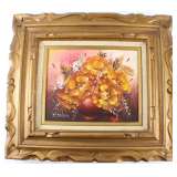 HIRO OIL ON CANVAS FLORAL STILL LIFE 20 x 16" canvas featuring abstract painterly floral still life framed in ornate gold frame. Signature lower right, Hiro. Some cracks and paint loss to gesso on frame. Size: 25.5 x 29.5" framed, Est. 50-150, Lot: 32058
