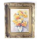 VIRGINIA OIL ON CANVAS FLORAL ARRANGEMENT 10 x 8" canvas featuring oil painting of floral arrangement. Signed lower left Virginia. Size: 17 x 15" framed, Est. 50-150, Lot: 32057