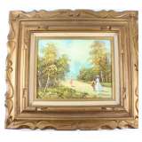 MANSEAUX OIL ON CANVAS SMALL LANDSCAPE 10 x 8" canvas featuring landscape with three girls walking. Signed lower right J Manseaux. Size: 17 x 15" framed, Est. 50-150, Lot: 32062