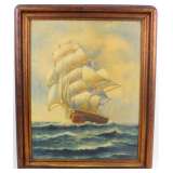 WESLEY WARREN PAINTING CLIPPER SHIP OIL ON CANVAS Wesley Warren (American, 20th century). Painting, Oil on canvas featuring clipper ship at sea. Framed in wooden frame with gold accents. Signature bottom right. Some cracking throughout, light spotting on right side. Size: 27 x 34" (framed), Est. 150-300, Lot: 32064