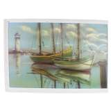 AL BLACK - FLORIDA HIGHWAYMEN PAINTING AIRBRUSH Albert "Al" Black (American, b. 1946). Harbor scene with two sailboats and lighthouse in background. Rare airbrush on board, framed. Signature bottom right, dated 1980. Size: 37 x 25" (framed), Est. 100-300, Lot: 32065