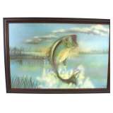 AL BLACK - FLORIDA HIGHWAYMEN PAINTING ON BOARD Albert "Al" Black (American, b. 1946). Bass fish jumping out of water. Rare airbrush on board, framed. Signature bottom right, dated 1980. Small stain, bottom right of canvas, some paint loss along the top left. Size: 39 x 28" (framed), Est. 100-300, Lot: 32067