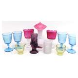 LOT OF DEPRESSION AND PRESSED GLASS Glass lot includes: four blue pressed glass goblets, a creamer and sugar yellow depression glass set, a jack-in-the-pulpit pink and white floral vase, a pair of naval-theme etched glass cups with Koi fish stems, a purple glass hand holding a cornucopia and a small white hobnail glass vase. Size: Smallest: 3" - Largest: 8 1/2", Est. 50-100, Lot: 32070