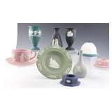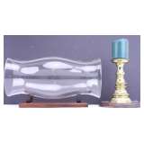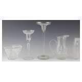 5 CRYSTAL PIECES GORHAM WEDGEWOOD BLOCK & MORE Mixed grouping of varies glassware. Rosenthal vase 10", Block pitcher 6.5", Atlantis bud vase 6", Gorham potpourri dish 3.5", and Wedgewood vase 7" (small chip to rim). Size: N/A, Est. 30-60, Lot: 32072