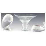 STEUBEN CLEAR GLASS CRYSTAL OWL WHALE AND BOWL Steuben Clear Glass Crystal to include; 1955 Steuben crystal figural owl #8065 measures 5.5", signed Steuben on base, small chip off of underside of base, does not detract from item. 1956 Steuben crystal figural whale, # 8075, signed Steuben on base, measures 5.25". Steuben Crystal Vase flair rim and thumbprint sides. Signed Steuben on base measures 5 x 7", small chip around rim. Size: N/A, Est. 300-500, Lot: 32075