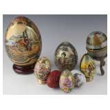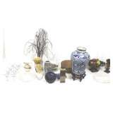 LARGE GROUP OF HOUSEHOLD DECORATIVE ITEMS Large group of household decorative items including; Glass vase measuring 11 x 5", Large glass vase filled with decorative rocks measures 17 x 7", 8 plastic glasses with jewel designs measures 7 x 5", Large blue and white floral design vase with wooden stand measures 21 x 7", Stalk of decorative sticks measures 40", 8 wooden braided placemats measures 14", Mosaic candleholder vase measures 17 x 7", Porcelain ashtray measures 7 x 7", Decorative blue bowl with star pattern measures 7.5 x 7", Neiman Marcus Pitcher 8 x 5.5, Milcast glass bowl measures 13", Bay of wheat measures 11 x 6", Lantern shaped candle holder measures 11 x 5.5", A pair of wooden decorative holders with fruit designs measures 11 x 5", Decorative Seed holder measures 12 x 4", Decorative fruit holder with felt fruit, measures 9 x 12", Oval glass bowl measures 16 x 10.5". Size: N/A, Est. 30-50, Lot: 32076