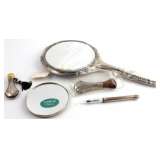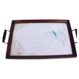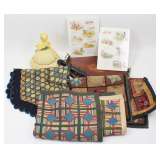 LOT OF MISCELLANEOUS HOME DECORATION ITEMS Lot of Miscellaneous Home Decoration Items to include; Regency stylized Inlaid Tea Tray with brass handles, in fair condition measures 19 x 12 x 1.75". Two Disney Prints of stories, "The Pointer", with "GH 6/39" on back in pencil and "Mickey's Parrot" with "GH 6/38" on back in pencil, each measures 12 x 8.75". Reproduction British Dagger with sheath, blade is showing wobble, measures 12.25 in sheath, 10.75 without sheath, blade is 6.5". 3 area rugs, Floral Design measuring 36 x 28.5", Hexagon Shaped rug with circle colors ranging from tans, blues, and grays, measures 28.75". Area rug with circular patterns of various colors, measures 37 x 23.5". Roman Art Company Romia Ware Figurine of girl holding a flower, label on bottom of figure numbered 1776, measures 11.5". Size: N/A, Est. 20-40, Lot: 32077