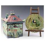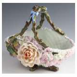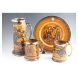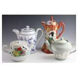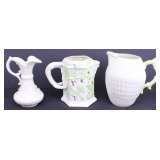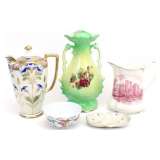 LOT OF 5 DECORATIVE PORCELAIN ITEMS Lot includes: one shallow floral German Bareuther dish, a floral Chinese rice bowl, one red transferware pitcher depicting "Ragland Castle in 1792" made by Johnson Bros. in England, one green transferware two-handle pitcher depicting a country scene made in England, and one Nippon hand painted chocolate pitcher. Size: Smallest: 1" to Largest: 11", Est. 30-60, Lot: 32078
