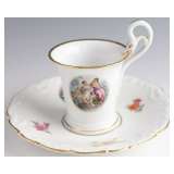 MEISSEN HANDPAINTED PORCELAIN CUP AND SAUCER Fine porcelain cup and saucer by Meissen decorated with hand painted flowers and a Grecian scene. Size: 5" diameter saucer, Est. 40-60, Lot: 32079
