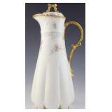 HAND PAINTED LIMOGES PITCHER WITH LID 11" Limoges pitcher painted with pink floral pattern and gold trim. Size: 11", Est. 50-150, Lot: 32083