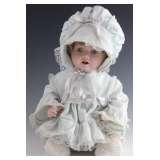 GERMAN 1070 BISQUE BABY DOLL HILDA Marked 8/85 Hilda JDK Jr 1914 Hilda, signed "Patricia Ladrie". Bisque socket head, body, and socket legs. Stationary blue glass eyes, painted lashes, open mouth, two upper teeth, and, light greenish blue cotton gown, bonnet, and bloomers. Size: 15", Est. 50-150, Lot: 32122