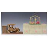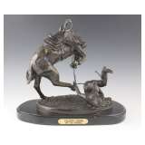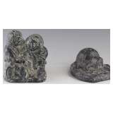 TWO COMPOSITE CANADIAN WOLF SCULPTURES Two hand made composite sculptures. One shows an igloo outside of which a mother and child are seated in front of a sleight. The other is a sculpture of two seated children wearing Inuit styled clothing. Both have stickers on their bases declaring them to be "A Wolf Original Hand made in Canada." Size: Small - 1 1/2" tall Large - 3 1/4" tall, Est. 25-50, Lot: 32130