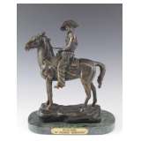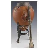 ALPACCA BOMBILLA AND MATE BOWL Silver bombilla straw with perforated base with its silver rimmed mate bowl. The bowl rests on a three prong stand, and has western engravings on three sides. One depicts a cow hand on a bucking horse, the second a seated man playing the accordion and the third a seated man by a campfire. The stand also has western and gilt designs. Bombilla is signed "Alpacca Eberle." Size: Bowl: 9 1/4" on stand Bombilla: 9", Est. 25-100, Lot: 32132