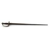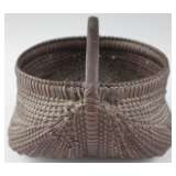 VIRGINIA SPLINT RIB-TYPE WOVEN BASKET A splint woven basket of stained ash. Wrapped double rim. Woven rib separates a bulbous kidney form, over which a simple handle is arched. Stiff construction and tight weave. Dry surface. From a Virginia estate. Late 19th century. Size: 6 1/2 x 5 x 6", Est. 100-200, Lot: 32133