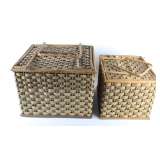 SET OF TWO NESTED PICNIC BASKETS Two picnic baskets with handles. Large basket is 16 x 14 x 12", smaller basket is 13 x 11 x 10". Smaller basket has one handle detached. Smaller basket fits inside of larger basket. Size: 16 x 14 x 12", Est. 20-50, Lot: 32134