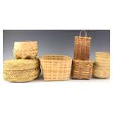 LOT OF SMALL NATIVE AMERICAN BASKETS Native American oval woven lidded basket. 3" tall, 6" wide, 8" long. No signature. Native American square open basket, 4 1 /2 inches tall. Woven palm fronds basket. Seminole made open basket. No signature. Curly woven palm fronds basket. Open basket with 4 1/2" diameter. No signature. Signed small wall basket. 9" tall, 4" wide, 2 1/2" deep. Size: varied, Est. 50-150, Lot: 32135